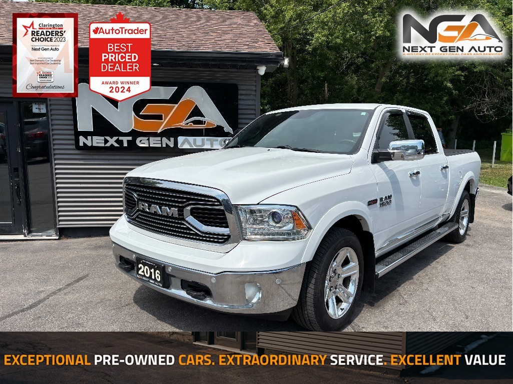 NO ADMIN FEES! NO GAS FEES! SAFETY CERTIFIED! FULLY DETAILED!, CLEAN CARFAX / NO ACCIDENTS!! Navigation, Back-Up Camera, Bluetooth, Power Moonroof, Leather Interior Seat Trim, Heated Leather-Wrapped Steering Wheel, Push Button Start w/ Smart Key System, Memory Seat Function, Rear Heated Seats, Heated & Ventilated Front Bucket Seats, 10-Way Power Driver Seat w/ Lumbar Support, 6-Way Power Passenger Seat, Remote Starter, 10 Speakers, 115-Volt Auxiliary Power Outlet, 3.55 Rear Axle Ratio, 4-Corner Air Suspension, 4-Wheel Disc Brakes, ABS brakes, Add Tow Hooks, Adjustable pedals, Air Conditioning, Alloy wheels, AM/FM radio: SiriusXM, Audio memory, Auto-dimming door mirrors, Auto-dimming Rear-View mirror, Automatic High Beam Headlamp Control, Automatic temperature control, Block heater, Body Colour Fender Flares, Body Colour Front Fascia, Body Colour Rear Bumper w/Step Pads, Brake assist, Bucket Seats, Centre Hub, Chrome Belt Mouldings, Chrome Bodyside Moulding, Chrome Front Bumper, Chrome Rear Bumper, Chrome Wheel-to-Wheel Side Steps, Class IV Hitch Receiver, Compass, Delay-off headlights, Driver door bin, Driver vanity mirror, Dual front impact airbags, Dual front side impact airbags, Electronic Stability Control, Electronically Controlled Throttle, Fold-Flat Load Floor w/Storage, Front & Rear Luxury Floor Mats, Front anti-roll bar, Front dual zone A/C, Front fog lights, Front Heated Seats, Front High-Back Seats, Front reading lights, Front Ventilated Seats, Front wheel independent suspension, Full-Length Upgraded Floor Console, Fully automatic headlights, Garage door transmitter, Heated door mirrors, Heated Steering Wheel, Keyless Enter 'N Go w/Push Start, Laramie Limited Grille, Laramie Limited Group, Laramie Limited Instrument Cluster, Leather Wrapped Grab Handle, Leather-Faced Bucket w/Perforated Inserts, Leather-Wrapped Steering Wheel w/Wood, Limited Appearance Package, Limited Tailgate Applique 4x4, Low tire pressure warning, Luxury Door Trim Panel, Occupant sensing airbag, Overhead airbag, Panic alarm, ParkView Rear Back-Up Camera, Passenger door bin, Pedal memory, Power 10-Way Memory Driver & 6-Way Passenger Seats, Power door mirrors, Power Lumbar Adjust, Power steering, Power windows, Quick Order Package 28V Limited, Radio data system, Radio: Uconnect 8.4'' SXM/Hands-Free/Nav, Rain-Sensing Windshield Wipers, Ram 1500 Badge, Rear 60/40 Split Folding Seat, Rear anti-roll bar, Rear step bumper, Rear Window Defroster, Remote keyless entry, Remote Proximity Keyless Entry, Second-Row Heated Seats, Security system, Speed control, Split folding rear seat, Steering wheel mounted audio controls, Steering Wheel-Mounted Audio Controls, Traction control, Trailer Brake Control, Turn signal indicator mirrors, Variably intermittent wipers, Wheels: 20'' x 9'' Painted Aluminum w/Chrome Inserts. 2016 Ram 1500 Limited 4D Crew Cab 4WD EcoDiesel 3.0L V6 CARFAX available upon request! At Next Gen Auto, we care as much as you care about your next new vehicle! Let us help you fall in love with your ride again.