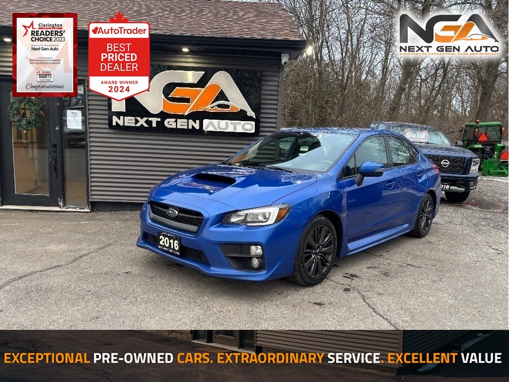 NO ADMIN FEES! NO GAS FEES! SAFETY CERTIFIED! FULLY DETAILED!! Back-Up Camera, Bluetooth, Heated Front Bucket Seats, Blind Spot Monitor / Rear Cross-Traffic Alert, 6-Way Power Driver Seat, Alloy Pedals, Power Liftgate, 3.90 Axle Ratio, 4-Wheel Disc Brakes, 6 Speakers, ABS brakes, Air Conditioning, AM/FM/CD/MP3/WMA Audio System, Automatic temperature control, Brake assist, Bumpers: body-colour, Driver door bin, Driver vanity mirror, Dual front impact airbags, Dual front side impact airbags, Electronic Stability Control, Four wheel independent suspension, Front anti-roll bar, Front reading lights, Heated door mirrors, Illuminated entry, Knee airbag, Leather Shift Knob, Occupant sensing airbag, Outside temperature display, Overhead airbag, Panic alarm, Passenger door bin, Passenger vanity mirror, Performance-Design Heated Front Seats, Power door mirrors, Power steering, Power windows, Radio data system, Rear anti-roll bar, Rear window defroster, Remote keyless entry, Security system, Speed control, Speed-sensing steering, Split folding rear seat, Sport steering wheel, Steering wheel mounted audio controls, Tachometer, Telescoping steering wheel, Tilt steering wheel, Traction control, Trip computer, Variably intermittent wipers, Wheels: 17'' x 8'' Aluminum Alloy 15-Spoke Design. 2016 Subaru WRX 4D Sedan AWD 2.0L Boxer H4 DOHC 16V Awards: * ALG Canada Residual Value Awards, Residual Value Awards CARFAX available upon request! At Next Gen Auto, we care as much as you care about your next new vehicle! Let us help you fall in love with your ride again.