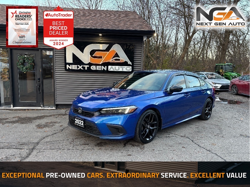 Recent Arrival! NO ADMIN FEES! NO GAS FEES! SAFETY CERTIFIED! FULLY DETAILED!, ONE OWNER, CLEAN CARFAX / NO ACCIDENTS!! Back-Up Camera, Apple Car Play / Android Auto, Bluetooth, Power Moonroof, Heated Front Bucket Seats, Heated Leather-Wrapped Steering Wheel, Push Button Start w/ Smart Key System, Blind Spot Monitor / Rear Cross-Traffic Alert, Foward Collision Warning System, Collision Mitigation Braking System, Road Departure Mitigation System, Adaptive Cruise Control w/ Low Speed Follow, Automatic High Beams, Black w/Cloth Seat Trim, 4-Wheel Disc Brakes, 8 Speakers, ABS brakes, Air Conditioning, AM/FM radio, Auto High-beam Headlights, Automatic temperature control, Black Door Visors, Black Style Package, Brake assist, Bumpers: body-colour, Combi Fabric Seating Surfaces, Delay-off headlights, Driver door bin, Driver vanity mirror, Dual front impact airbags, Dual front side impact airbags, Electronic Stability Control, Forward collision: Collision Mitigation Braking System (CMBS) + FCW mitigation, Four wheel independent suspension, Front & Rear Illuminated Door Sill Trim, Front anti-roll bar, Front dual zone A/C, Front reading lights, Fully automatic headlights, Heated door mirrors, Illuminated entry, Knee airbag, Leather Shift Knob, Leather steering wheel, Low tire pressure warning, Occupant sensing airbag, Outside temperature display, Overhead airbag, Overhead console, Panic alarm, Passenger door bin, Passenger vanity mirror, Power door mirrors, Power steering, Power windows, Radio: AM/FM Audio System, Rear anti-roll bar, Rear side impact airbag, Rear window defroster, Remote keyless entry, Security system, Speed control, Speed-sensing steering, Speed-Sensitive Wipers, Split folding rear seat, Steering wheel mounted audio controls, Tachometer, Telescoping steering wheel, Tilt steering wheel, Traction control, Trip computer, Turn signal indicator mirrors, Variably intermittent wipers, Wheels: 18'' Aluminum-Alloy Black. 2022 Honda Civic Sport BLACK STYLE PKG HEATED STEERING ROOF 4D Sedan FWD 2.0L I4 DOHC 16V i-VTEC Awards: * ALG Canada Residual Value Awards CARFAX available upon request! At Next Gen Auto, we care as much as you care about your next new vehicle! Let us help you fall in love with your ride again.